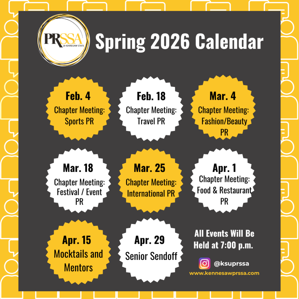 All events are held at 7:00 p.m and are open for PRSSA members or non-members alike. We look forward to welcoming all of you!